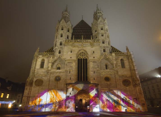 Wer in letzter Zeit im Zentrum Wiens über den Stephansplatz ging, wunderte sich vielleicht über die Lichterscheinungen und bunten Flächen, die auf das ehrwürdige Gemäuer des Domes projiziert werden. In einer gewissen Art wirken sie selbstverständlich, wie dazugehörig, sie verschmelzen mit dem Untergrund. Manchmal betonen die Farben die räumliche und die Schattenwirkung der vielen Vor- und Rücksprünge der Architektur, stellenweise wirken sie wie ein Farbteppich auf der Wand.