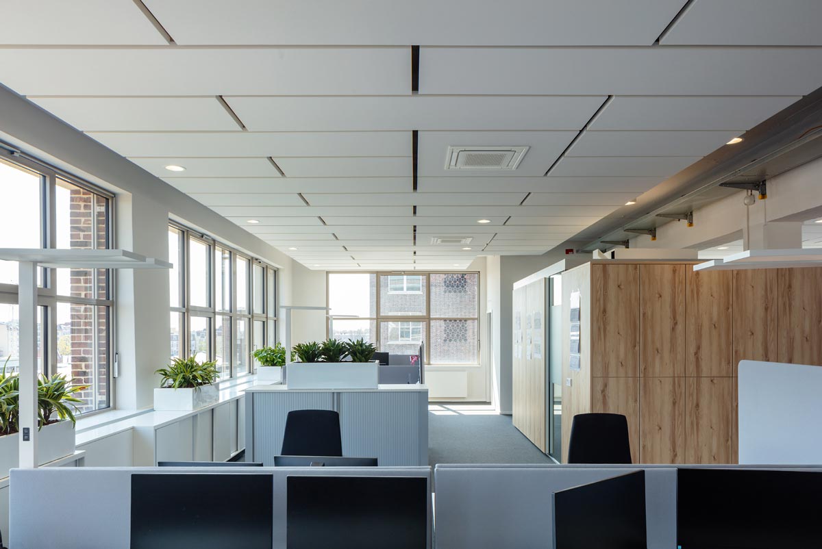 Aufgrund ihrer exzellenten Absorptionseigenschaften wurde die modulare Akustikdecke Ecophon Solo Matrix in den Büroräumen montiert. Optisch nimmt sie sich zurück und unterstützt den architektonischen Charakter der Räume. Da die verschiedenen Akustikelemente keine zusätzliche Umrandung haben, bleibt die Materialität homogen und angenehm fürs Auge. Auch die Auslässe der Klimaanlage ließen sich optisch und technisch perfekt in den Absorbern integrieren. Somit vermittelt die Umsetzung des architektonischen Konzeptes zwischen dem nicht veränderbaren, historischen Baukörper und einer flexiblen Ausstattung.
