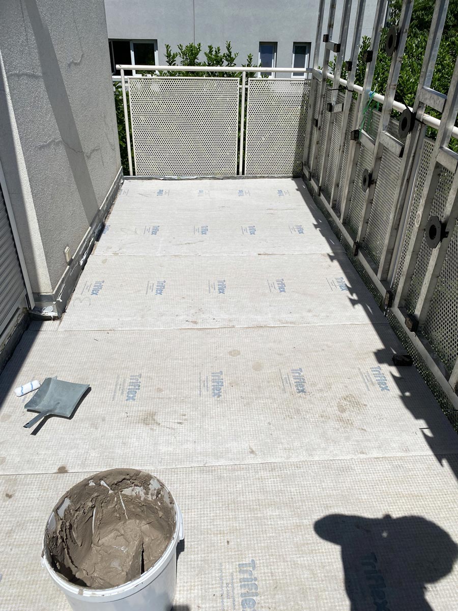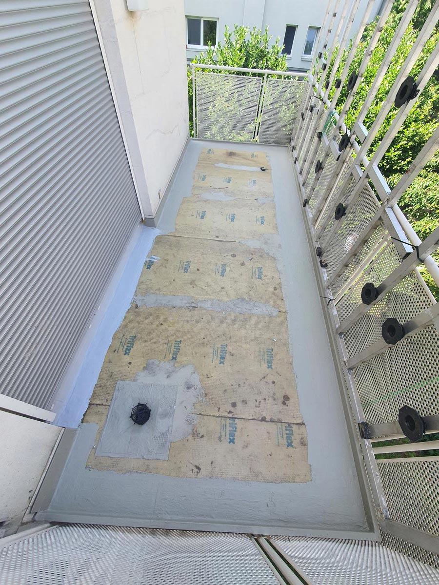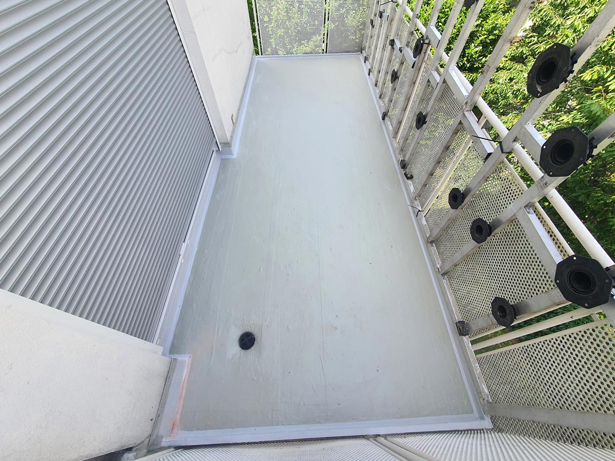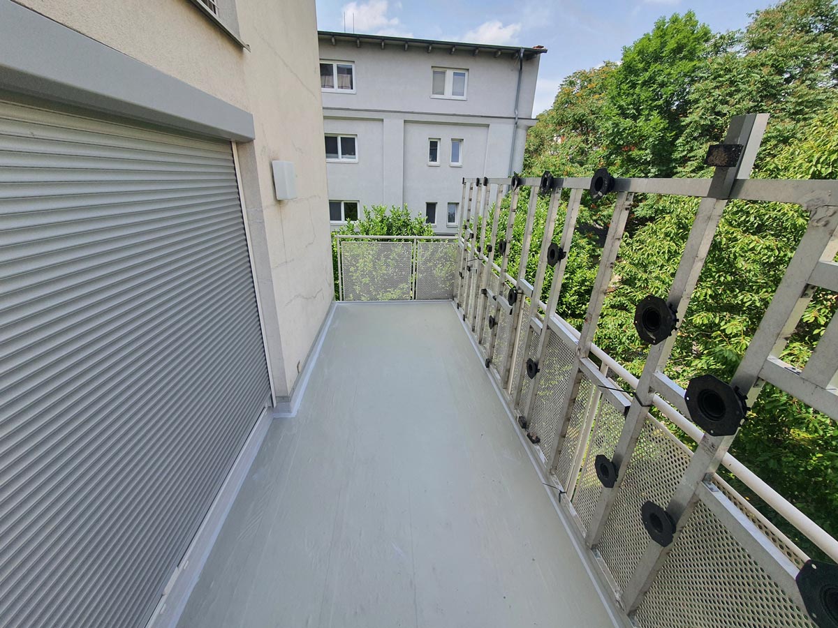 Das Ziel war den 14 m² großen Balkon ohne Abriss des bestehenden Fremdbelags dauerhaft abzudichten und die darunterliegende Wohnung effektiv vor Wassereintritt zu schützen. Zum Einsatz kam dafür das Balkon Entkopplungssystem Triflex ProDrain des Flüssigkunststoff-Herstellers Triflex: In Kombination mit dem Balkon Abdichtungssystem Triflex BWS auf Basis von Polymethylmethacrylat (PMMA) sorgt die Triflex Entkopplungsbahn DC-Mat für eine optimale Entlüftung und lässt den Untergrund nachträglich austrocknen. Diese Systemlösung wurde speziell für durchnässte Untergründe entwickelt und ist eine zeit- und kostensparende Alternative zu den sonst üblichen Sanierungsmaßnahmen bei einer feuchten Bausubstanz.