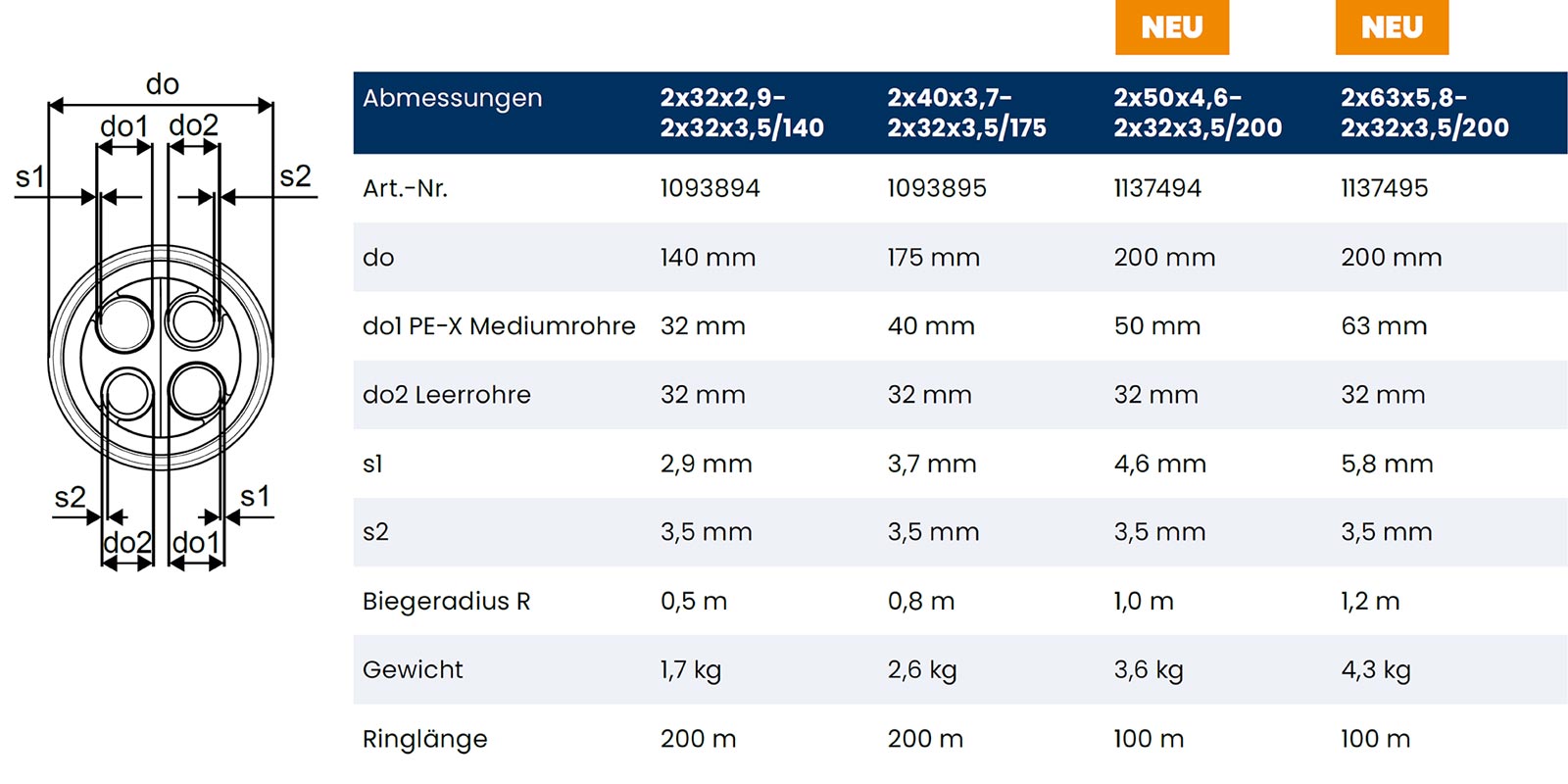 Uponor Ecoflex Thermo Twin HP-Rohre wurden speziell für Wärmepumpen entwickelt, um Heizungsvorlauf und -rücklauf sowie Strom- und Steuerleitungen in nur einem Systemrohr zu verwirklichen. Das Produkt ist jedoch auch für andere Versorgungsoptionen hervorragend geeignet wie z.B. die Anbindung einer Außensauna, eines Gartenhauses, eines Wintergartens oder einer Garage.