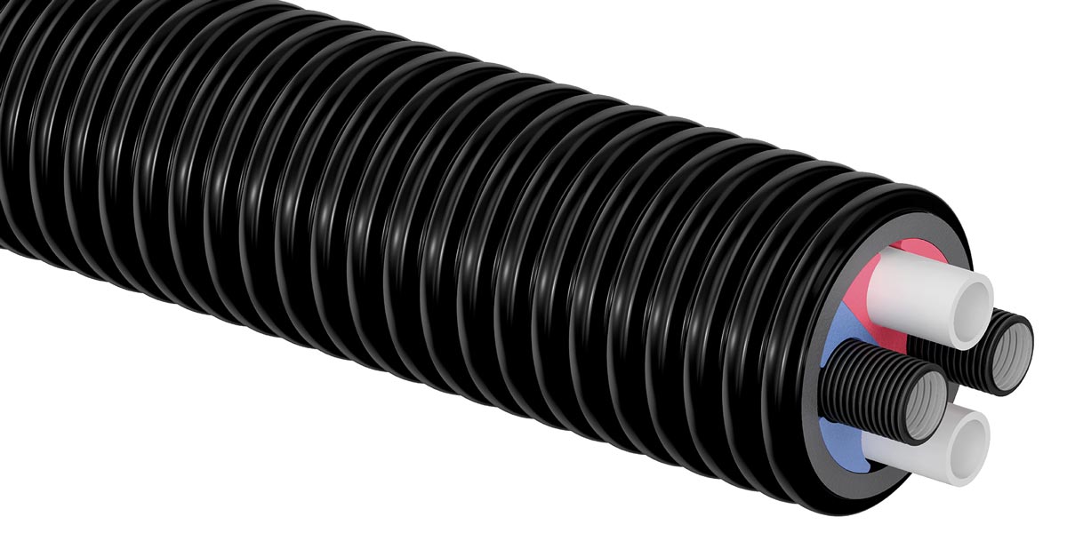 Als effiziente All-in-One-Lösung für die Wärmepumpenversorgung kombiniert Uponor Ecoflex Thermo Twin HP die Heizungsleitungen und Kabel-Leerrohre in einem Mediumrohr.