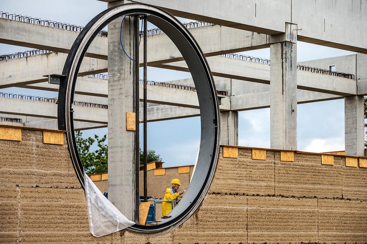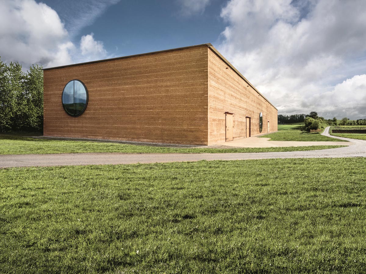 Geplant vom renommierten Architekturbüro Herzog & de Meuron entstand für den Kräuter-Bonbon-Hersteller RICOLA in Basel eines der größten Lehmgebäude Europas: Aus Erde, Kies und Mergel, traditionellen Rohstoffen und Baumaterialien aus dem Umkreis von unter 10 km, wurden innerhalb von fünf Monaten 666 Stampflehm-Blöcke vorgefertigt und montiert. Die 45 Zentimeter starken, selbsttragenden Außenwände sind an ein Tragwerk aus Betonfertigteilen angehängt.