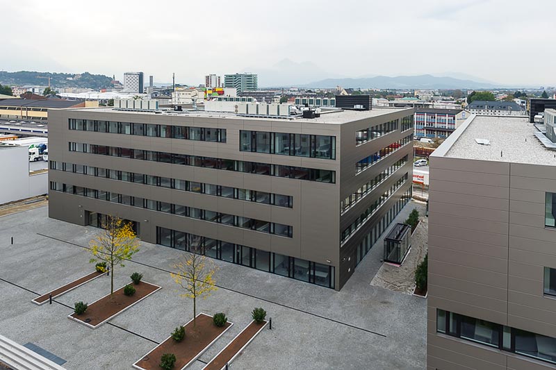 2008 wurde ein österreichweiter Wettbewerb zum Neubau des Informatik Headquarters ausgeschrieben, bei dem die Mayr-Architekten ZT GmbH den 1. Preis belegte. Der urbane Kontext des Wettbewerbsgrundstückes mit den, die Lagerhausstraße flankierenden großvolumigen Gewerbebauten im Süden und Osten, von dort übergehend zu klein-maßstäblichen Wohnbauten im Norden und der Bahn im Westen, bedingte eine besonders sorgfältige städtebauliche Situierung weiterer Baukörper. Das Hauptaugenmerk bei der Gebäudefunktion wurde auf die Flexibilität gelegt. Damit ist eine entsprechende Nachhaltigkeit der Gebäudenutzung garantiert. Die Gebäude selbst sind als monolithischer Kubus, deren Innenhöfe sich durch jeweils einen zweigeschossigen Ausschnitt im EG, sowie im DG zur beeindruckenden Stadtlandschaft öffnen, konzipiert. Bei diesem Projekt war die exzellente, handwerkliche Umsetzung, vor allem in den Detaillösungen, von größter Bedeutung. Die Fassaden wurden durch rhythmisch versetzte Fensterbänder, die auch in ihrer Höhe variieren, gegliedert. Die architektonisch hochwertigen, horizontal angeordneten Fassadenplatten DOMICO Planum 32 unterstreichen die Dynamik des erfolgreichen Unternehmens. Vom Hauptbahnhof kommend, beeindruckt der titanfarbig, glimmernde Monolith schon aus der Ferne. Er besticht durch seine Klarheit und Einfachheit.
