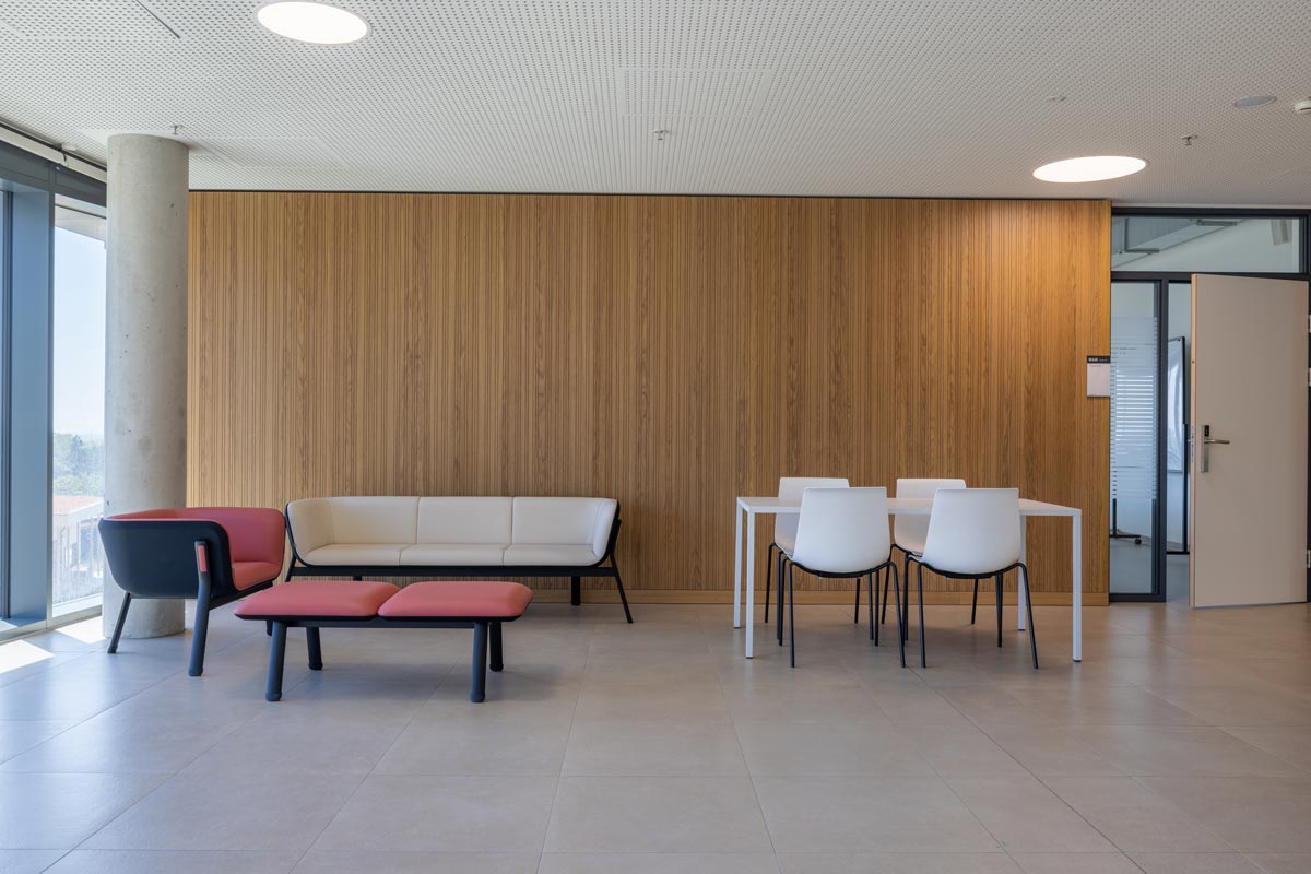 Auf mehreren Ebenen der Ausbildungsstätte wurden Kommunikationszonen eingerichtet, die sowohl leicht zu reinigen sind als auch den Brandschutzbestimmungen der EU ((EN 1021 Teil 1+2) entsprechen. Eingesetzt wurden dafür verschiedene Elemente der HUB Kollektion, ein vielseitiges modulares System zur individuellen und kreativen Büroraumgestaltung. Zusätzlich wurde ein passendes Farbkonzept erarbeitet – so laden die Kommunikationsbereiche nicht nur zum Lernen, sondern auch zum interaktiven Austausch ein. Auch die Aufenthaltsräume wurden neu gestaltet – hier wurden Stapelstühle und Stehhocker der SHUFFLE-Kollektion integriert. Zusätzlich wurden alle Büros mit EVERY-Drehstühlen ausgestattet: Hohe Netz-, Chillback- und Vollpolsterrücken, eine höhen- und tiefenverstellbare Lordose und eine ergonomisch optimal anpassbare Armlehne sorgen für hohen Komfort und Ergonomie am Arbeitsplatz.