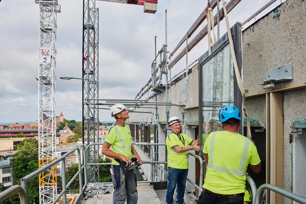 Ein zentrales Element dieser CO2-Reduktion bildet die nachhaltige Erneuerung der Gebäudehülle. Die alte Aluminium-/Glas-Fassade wurde vollständig rückgebaut und recycelt. In enger Zusammenarbeit von WICONA, Saint-Gobain Glass und der Heinrich Würfel Metallbau GmbH wurde eine neue Fassadenlösung entwickelt, die konsequent auf zirkuläre Wertschöpfung setzt. Heinrich Würfel, Geschäftsführer des ausführenden Metallbauunternehmens, erklärt: „Wir haben den Rückbau der Bestandsfassade gleich von Beginn in der Ausschreibung mit angeboten mit dem Ziel, die ausgebauten Rohstoffe wieder in den Wertstoffkreislauf zurückzuführen.“