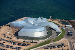 Aus der Luft wirkt es wie ein überdimensionales Windrad oder ein gigantischer Wasserstrudel: Nordeuropas größtes und modernstes Aquarium „Blue Planet“ auf der Insel Amager in Kopenhagen.