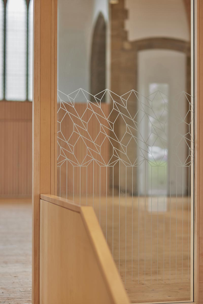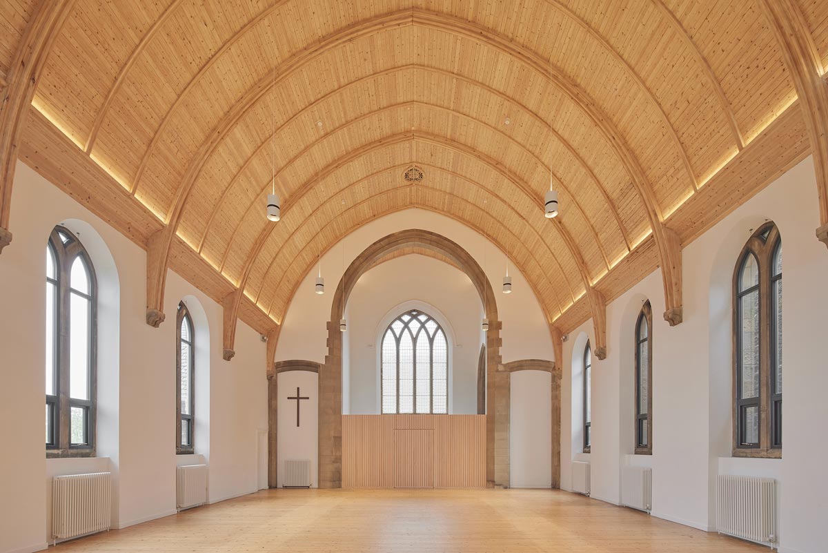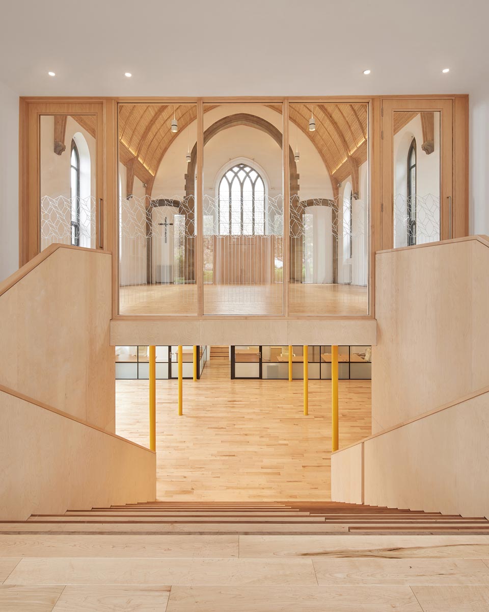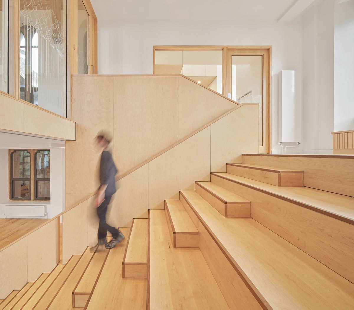 Den Innenausbau realisierte das Planerteam in enger Zusammenarbeit mit den lokalen Tischlermeistern von Old School Fabrications weitgehend in Holz. Sämtliche neu ergänzten Elemente – wie die zentrale Treppe, Wand- und Deckenverkleidungen sowie Einbauten und Möbel – wurden in dem Werkstoff umgesetzt. Amerikanischer Ahorn, Nussbaum, Birkensperrholz und schlichtes Weiß prägen die natürliche Materialpalette und bilden einen hellen Kontrast zur historischen Bausubstanz. Auch die gewölbte Kieferndecke des presbyterianischen Kirchenschiffs befreite man von ihrer dunklen Beize. In Kombination mit großflächigen Verglasungen und gezielter Beleuchtung zeigt sich der fast 11 m hohe Veranstaltungssaal nun freundlich und einladend. Über dem Eingang trennt in der Empore ein leichter, lamellenartiger Holzvorhang den intimen, nicht-konfessionellen Gebetsraum vom Saal ab. Er lässt subtile Blickbezüge zu und sorgt gleichzeitig für die nötige Privatsphäre der Betenden. Der lichtdurchflutete Coworking-Space im Souterrain lässt sich über Holztrennwände vom Erschließungsbereich abgrenzen und flexibel bespielen. Schmale, gelbe Säulen aus Gusseisen zonieren den Raum. Mit den schwarzen Sprossen der Glaswände, die im hinteren Teil zwei Büros einfassen, vermitteln sie ein industrielles Flair.