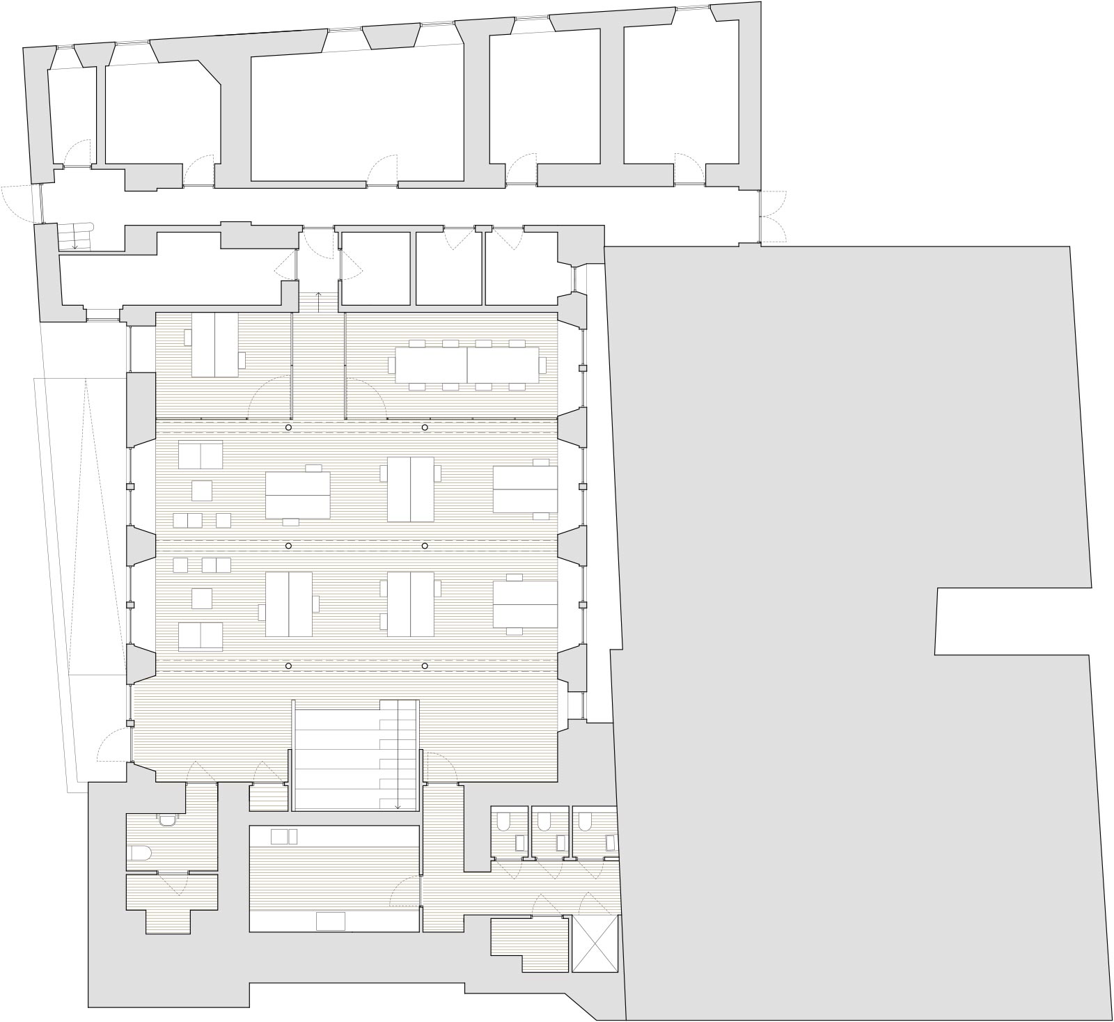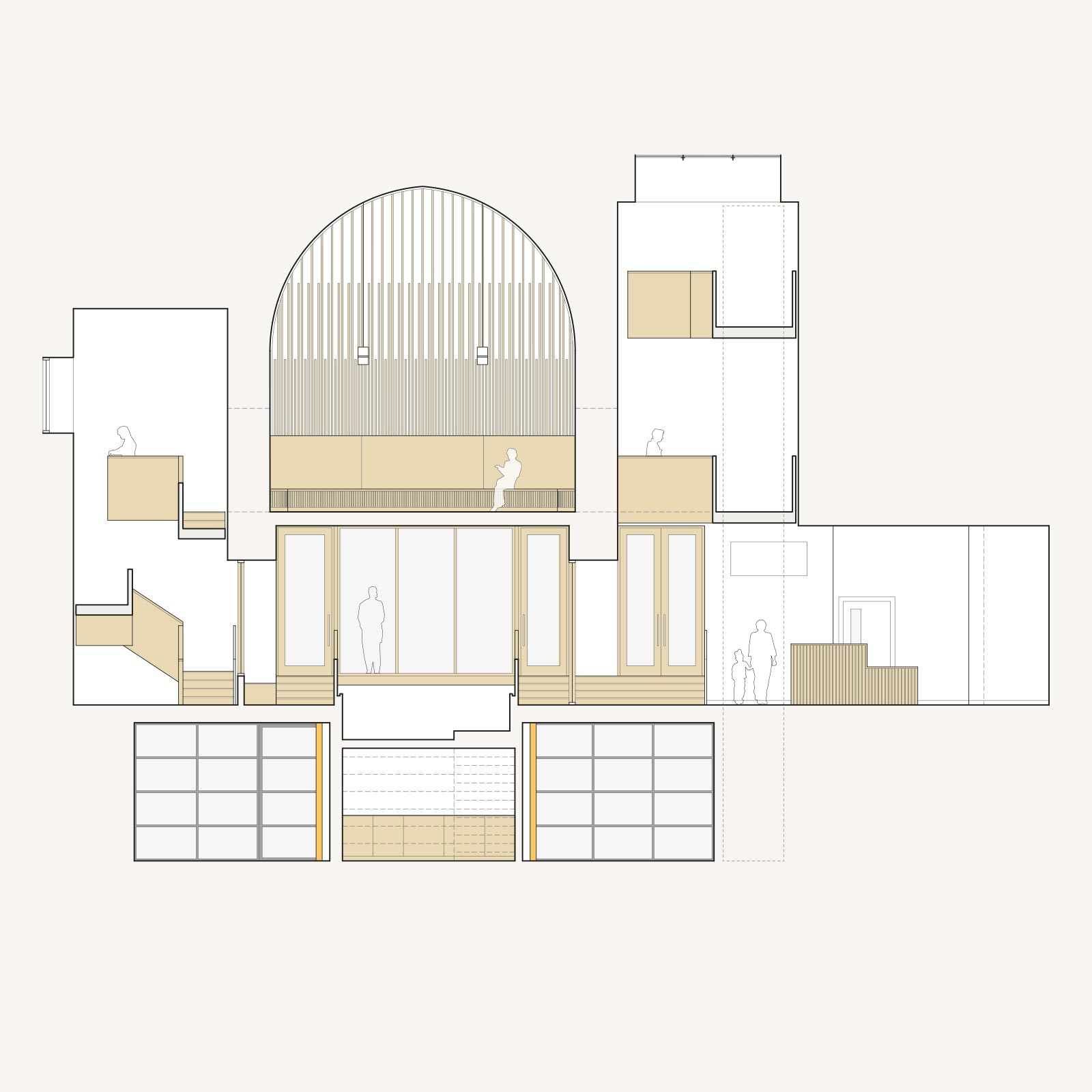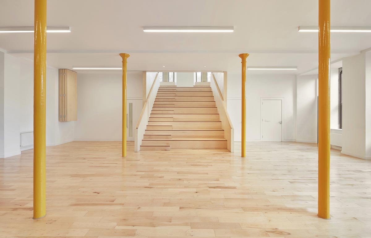 Den Innenausbau realisierte das Planerteam in enger Zusammenarbeit mit den lokalen Tischlermeistern von Old School Fabrications weitgehend in Holz. Sämtliche neu ergänzten Elemente – wie die zentrale Treppe, Wand- und Deckenverkleidungen sowie Einbauten und Möbel – wurden in dem Werkstoff umgesetzt. Amerikanischer Ahorn, Nussbaum, Birkensperrholz und schlichtes Weiß prägen die natürliche Materialpalette und bilden einen hellen Kontrast zur historischen Bausubstanz. Auch die gewölbte Kieferndecke des presbyterianischen Kirchenschiffs befreite man von ihrer dunklen Beize. In Kombination mit großflächigen Verglasungen und gezielter Beleuchtung zeigt sich der fast 11 m hohe Veranstaltungssaal nun freundlich und einladend. Über dem Eingang trennt in der Empore ein leichter, lamellenartiger Holzvorhang den intimen, nicht-konfessionellen Gebetsraum vom Saal ab. Er lässt subtile Blickbezüge zu und sorgt gleichzeitig für die nötige Privatsphäre der Betenden. Der lichtdurchflutete Coworking-Space im Souterrain lässt sich über Holztrennwände vom Erschließungsbereich abgrenzen und flexibel bespielen. Schmale, gelbe Säulen aus Gusseisen zonieren den Raum. Mit den schwarzen Sprossen der Glaswände, die im hinteren Teil zwei Büros einfassen, vermitteln sie ein industrielles Flair.