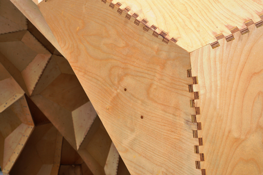Der Pavillon wurde trotz seiner beachtlichen Abmessungen durchweg aus nur 6,5 mm dünnen Sperrholzplatten realisiert und musste daher vor allem gegen Abheben durch Windsog gesichert werden.