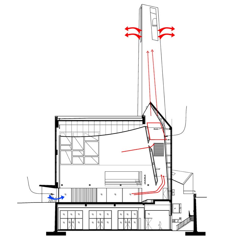Auch die Nachhaltigkeit wurde beachtet. Nachdem die ortsüblichen Materialien für eine Basis der thermischen Isolierungen sorgen, hat man ein System zur natürlichen Klimatisierung der Räume entwickelt. Dazu wird die enorme Höhe des Glockenturmes als Kamin benutzt, um durch große Gitter Luft aus dem Kirchenraum abzusaugen. Weiters ist der Großteil der Räume unter der Erde gelegen und somit wird die Temperatur angenehm und konstant gehalten. Licht erhalten diese Bereiche durch großzügige und abgesenkte Innenhöfe. Überhaupt haben die Planer versuchte, elektrische Beleuchtung in den Nutz- und Arbeitsräumen so weit wie möglich durch Tageslicht und dessen Lenkung zu vermeiden.