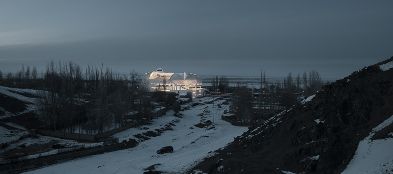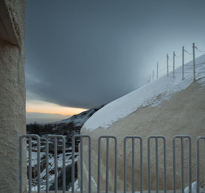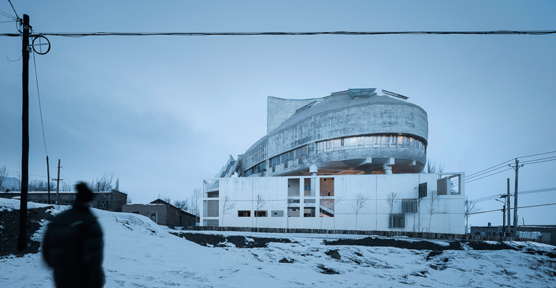 In der schneebedeckten Landschaft am Rand der Wüste Gobi wirkt die Architektur unwirklich. Alle Oberflächen sind unbehandelt und verstärken diesen Eindruck.