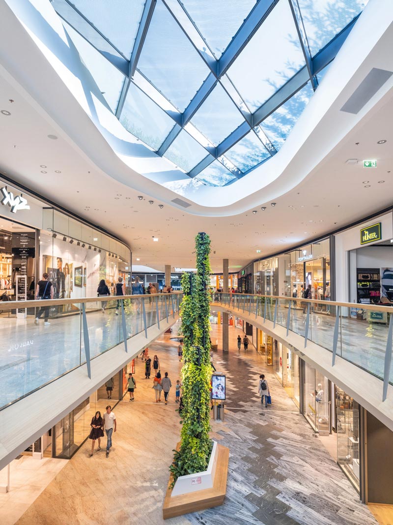 Um den hohen Ansprüchen an die technische Gebäudeausstattung gerecht zu werden, war besonders bei der Umsetzung der charakteristischen Dach- und Fassadenflächen, die Großteils verglast sind, einiges an Optimierung notwendig. Hier setzten die Architekten und Ingenieure auf eine BIM-Methode. Mit deren Hilfe konnte die Shoppingmall modellbasiert und integral umgesetzt werden. Auch die Zusammenarbeit zwischen den externen Partnern und dem Generalunternehmer ATP wurde dadurch extrem erleichtert. Die einzelnen Planungsschritte bis hin zur Montage der Fassade konnten losgelöst voneinander ausgefertigt und schließlich in das gemeinsame Gesamtmodell zurück übertragen werden.
