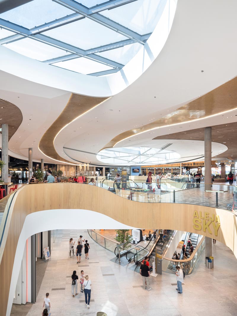 Im Eingangsbereich öffnet sich die Glashaut in Form einer einladenden Geste und soll laut den Architekten an ein Drachenmaul erinnern. Das Innere des Shoppingcenters ist ebenfalls geprägt von der intelligenten Fassade. Sie sorgt mit ihren wechselnden Feldern nicht nur für die nötige Privatsphäre in den rund 80 Shops, Bars und Restaurants, sondern ergibt – in Kombination mit Sonneneinstrahlung oder vorbeiziehenden Wolken – außerdem spannende Licht-Schatten-Spiele. Zentrale Atrien lockern ALEJA an mehreren Stellen auf. Sie werden von Rolltreppen und umlaufenden Galerien strukturiert. Durch sogenannte Lichtinseln fällt das Tageslicht hier durch die Fassade bis ganz nach unten. Die Innenräume wirken hell und freundlich. Sie sind mit schlichten Materialien ausgestattet und ergeben – in Wechselwirkung mit dem fließenden Design, das sich auch hier fortsetzt – eine angenehme Atmosphäre. Hochwertiger Naturstein, Holzakzente und weiße Oberflächen erwecken einen edlen Eindruck. Zwischen grüner Bepflanzung, Wasser- und Brunnenanlagen werden die Besucher von großzügigen Sitzgelegenheiten und Ruhebereichen immer wieder zum Entspannen eingeladen.
