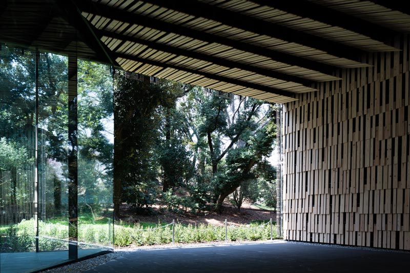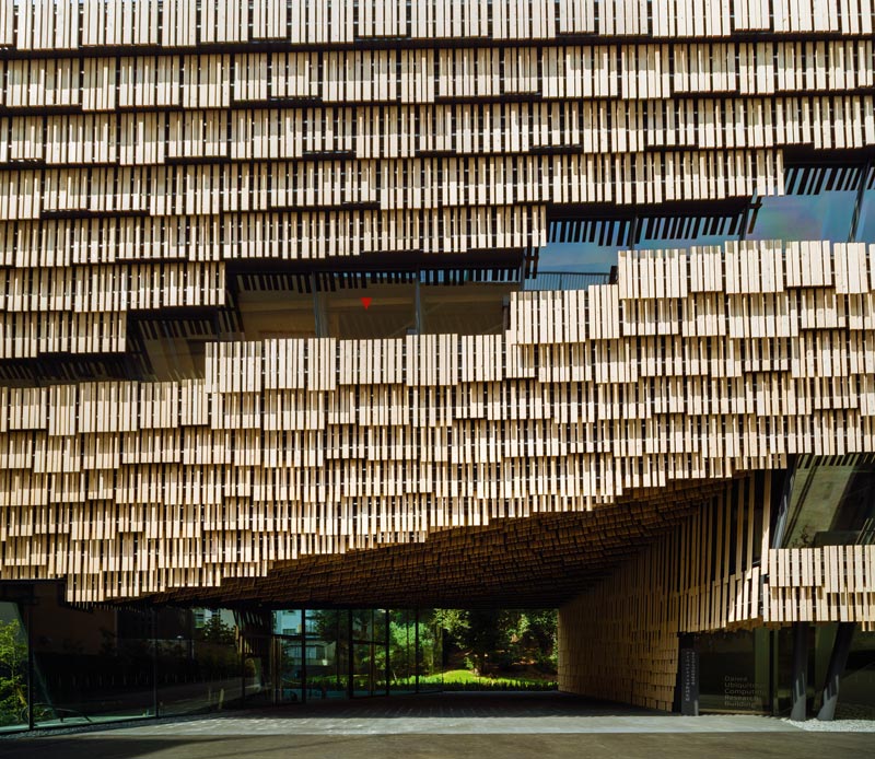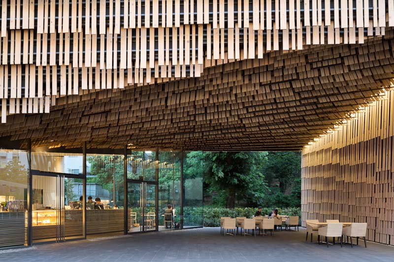 Jetzt wellen sich schindelähnliche Paneele aus Holz auf einer sanften, organisch geformten Fassade. In der Mitte der Ansicht gibt eine Öffnung den Blick auf den im Inneren liegenden japanischen Garten frei. Sie sorgt auch für einen sanften Luftzug und Wind am Gelände, das sonst üblicherweise von striktem Rasterdenken bestimmt ist.