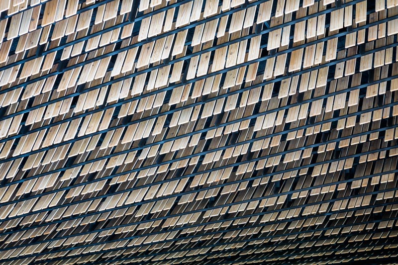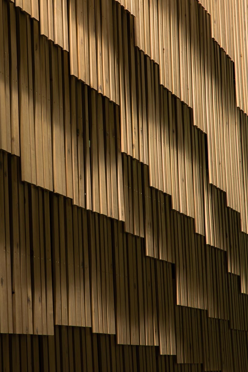 Hunderte dünne Schindeln aus Zedernholz bedecken in leicht diagonal ansteigenden Reihen die Fassade des 2.700 m2 Nutzfläche umfassenden, fünfgeschossigen Gebäudes. Zwei Ebenen sind unterirdisch und drei über der Erde. Die Holzbrettchen sind wie Klaviertasten aufgereiht und man könnte fast glauben, sie bewegten sich im Wind. Sie sind in Gruppen zu fünf oder zehn Stück angeordnet, auf einem Stahlrahmen befestigt und geben den Blick auf die unregelmäßig dahinter angeordneten Fensteröffnungen frei.