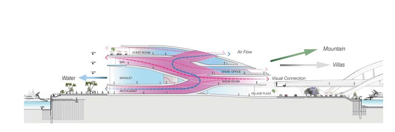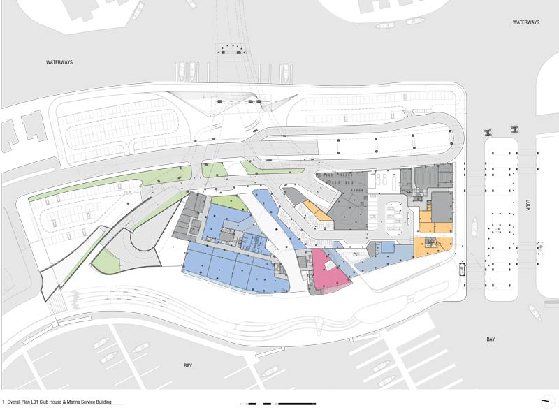 Das architektonische Konzept beruht auf einer starken Identität im Zentrum dieses Gebietes. Erreicht wird das durch Signale, die in visueller Form den vom Land (Norden) und von der See (Süden) Ankommenden, die Wichtigkeit der Marina verdeutlichen: Ein Spannungsbogen entsteht und drückt sich auch in der sich weit auffächernden Form aus. Von der Landseite über die Brücke kommend, baut sich die skulpturale Architektur langsam auf und entwickelt sich aus dem Näherkommen. Vom Meer her gesehen, heißt eine offene Ansicht mit einer Reflexion in der Wasserfläche die Ankommenden willkommen. Seitlich dehnt sich die Architektur in ausschweifenden Armen nach Ost und West langsam aus. Vor und hinter dem Klubgebäude befinden sich Plätze und Terrassen, sie dienen als Aufenthaltsflächen für Passagiere – Räumlichkeiten und Landschaftselemente durchbrechen diese Bereiche. Die Inspektions-. Immigrations- und Servicebauten sind im Süden gelegen.