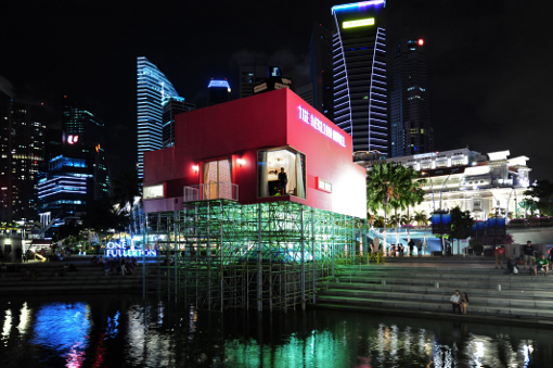 So auch sein Beitrag zur diesjährigen Art Biennale in Singapur. Er baute um das bekannte Wahrzeichen der Stadt Singapur – die Merlion-Skulptur im Hafen – ein Hotelzimmer mit Nebenräumen auf: das Merlion Hotel.