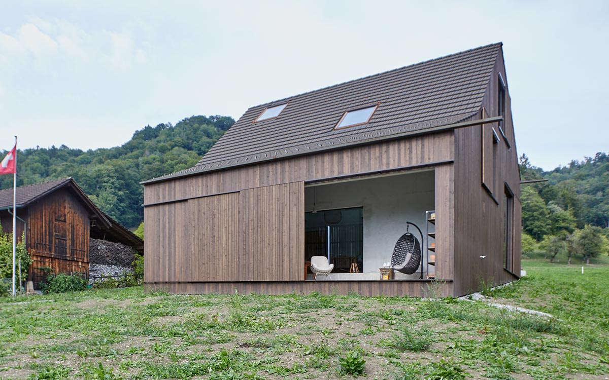 Dazu trägt vor allem die mit einer lasierten Fichtenholzschalung verkleidete Außenfassade bei, wie sie auch bei einer Scheune (Schüür) zu finden ist. Daran angelehnt wurde ein Steildach mit ortsüblicher Ziegeleindeckung ausgeführt und die öffenbaren Fensterflügel liegen hinter der Holzschalung verdeckt: Vor den großen Festverglasungen dienen Holz-Schiebetore als Sonnenschutz, Verdunklung und Sichtschutz. Ebenso wurde auf die üblichen Regenrinnen und -Rohre verzichtet, ein roher Stahlträger ist als Rinne vorgehängt und das Regenwasser wird seitlich – einem Wasserfall ähnlich – über die Schulter abgeleitet.