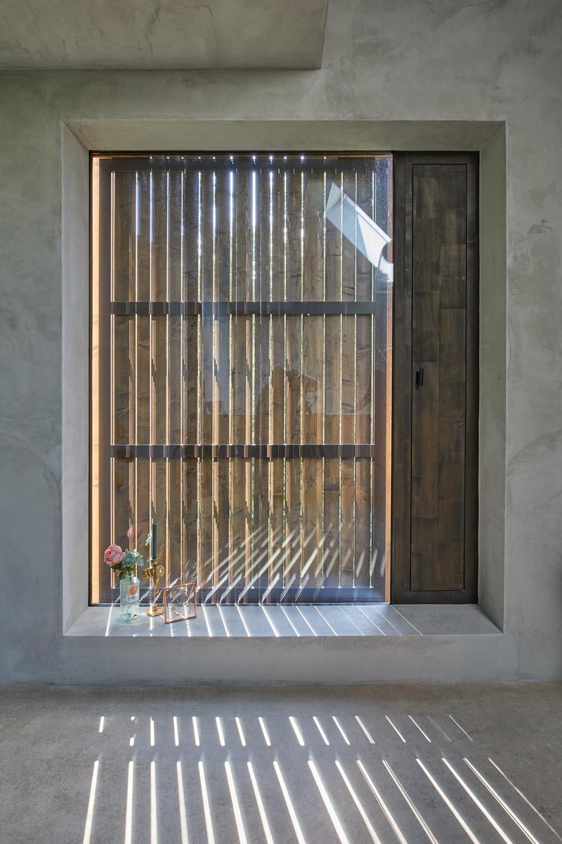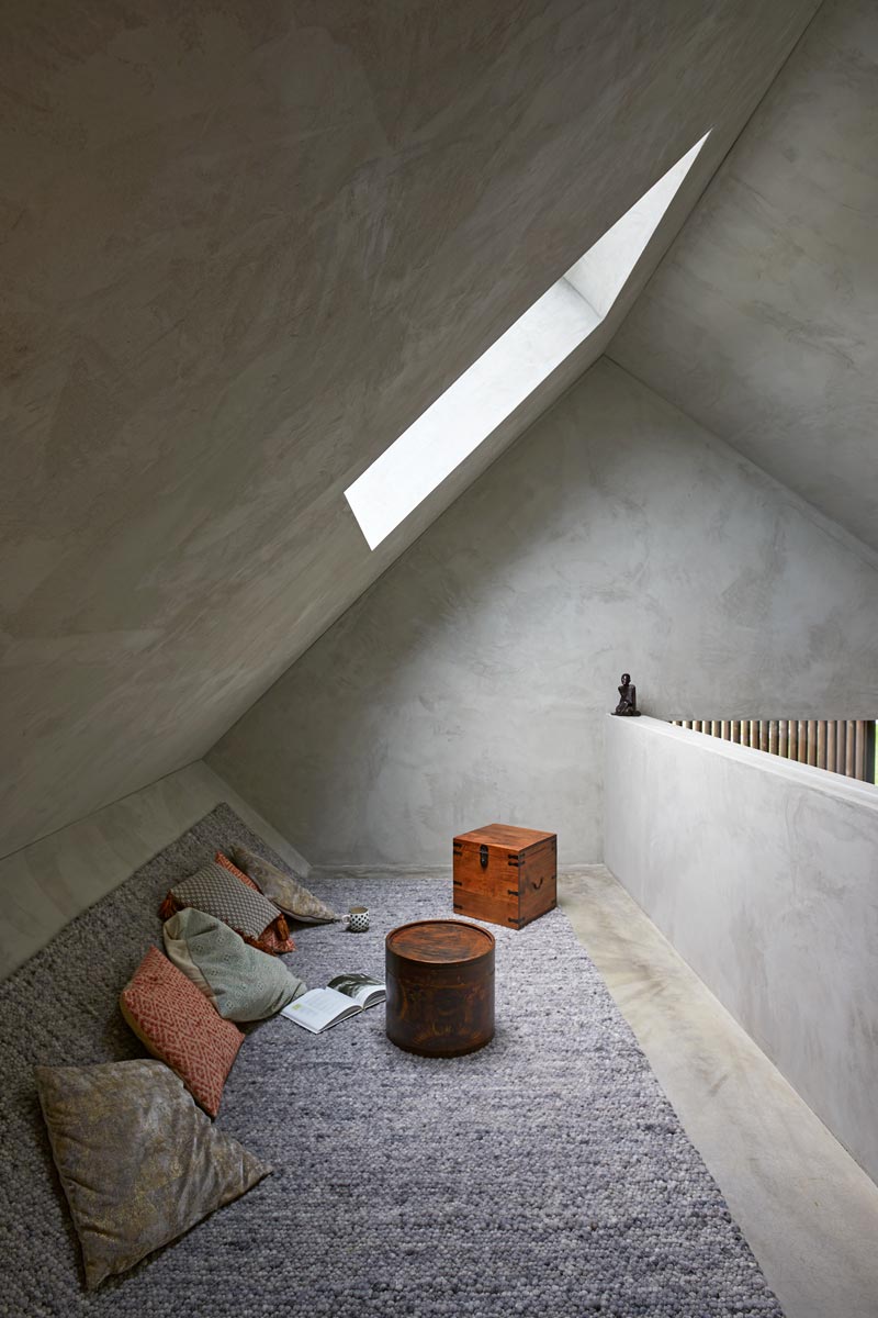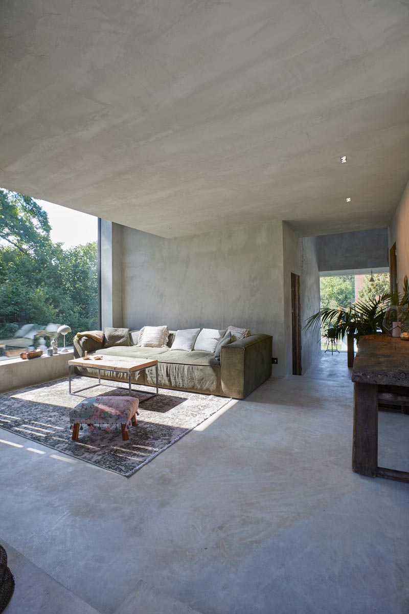 Ziel war es, einen Verputz zu erstellen, welcher sich mit den roh sichtbar belassenen Betonbodenplatten harmonisch zusammenfügt. Mit Muster-Experimenten wurde schließlich ein interdisziplinäres Ergebnis zwischen Industrie, Gipser und dem Architekten erarbeitet. Dabei wurde eine Mischung aus Quarzsand, Kalk und Weißzement als Basismaterial mit grauen mineralischen Pigmenten eingefärbt, zweimal nass in nass aufgetragen und ähnlich einer Freskotechnik verarbeitet und geglättet. Der zweiten Schicht wurden zusätzlich schwarze mineralische Pigmente – unregelmäßig von Hand – beigemengt. So konnten zwei unterschiedliche Materialien wie Beton und Verputz gesamtflächig ähnlich wirkend verarbeitet werden, was die Innenraumwirkung des Gebäudes ausdrucksstark prägt.