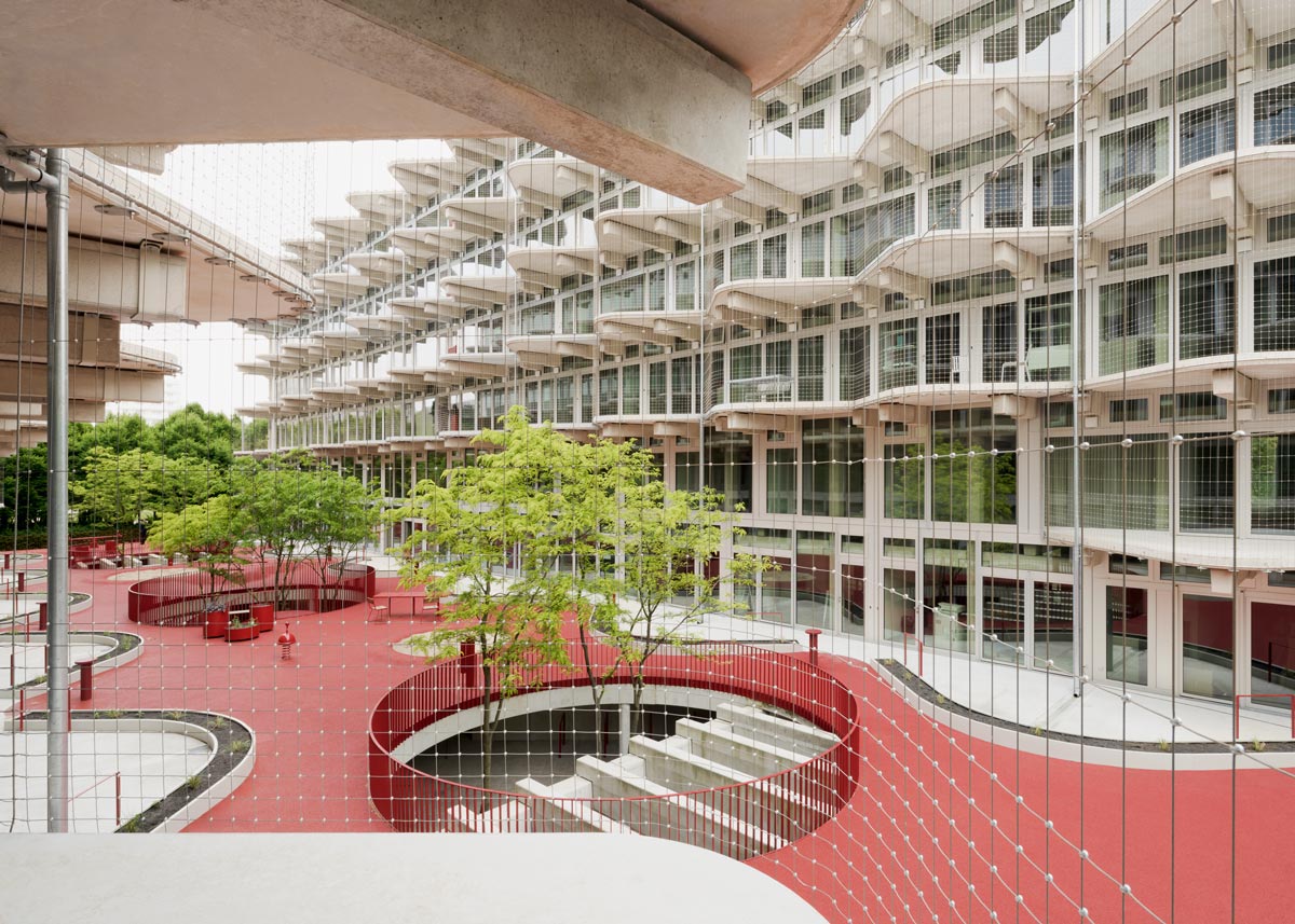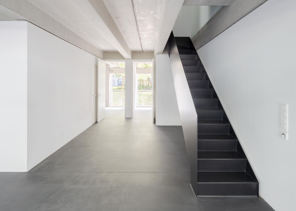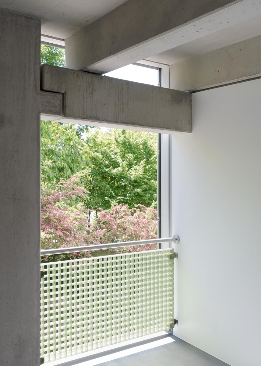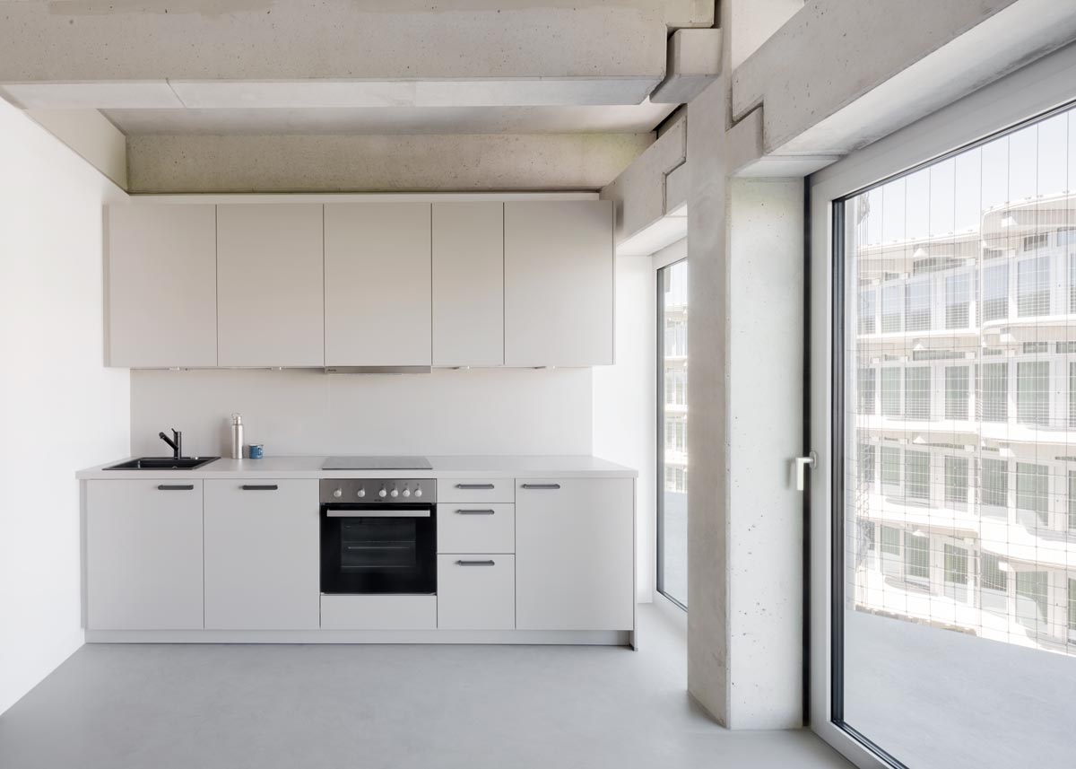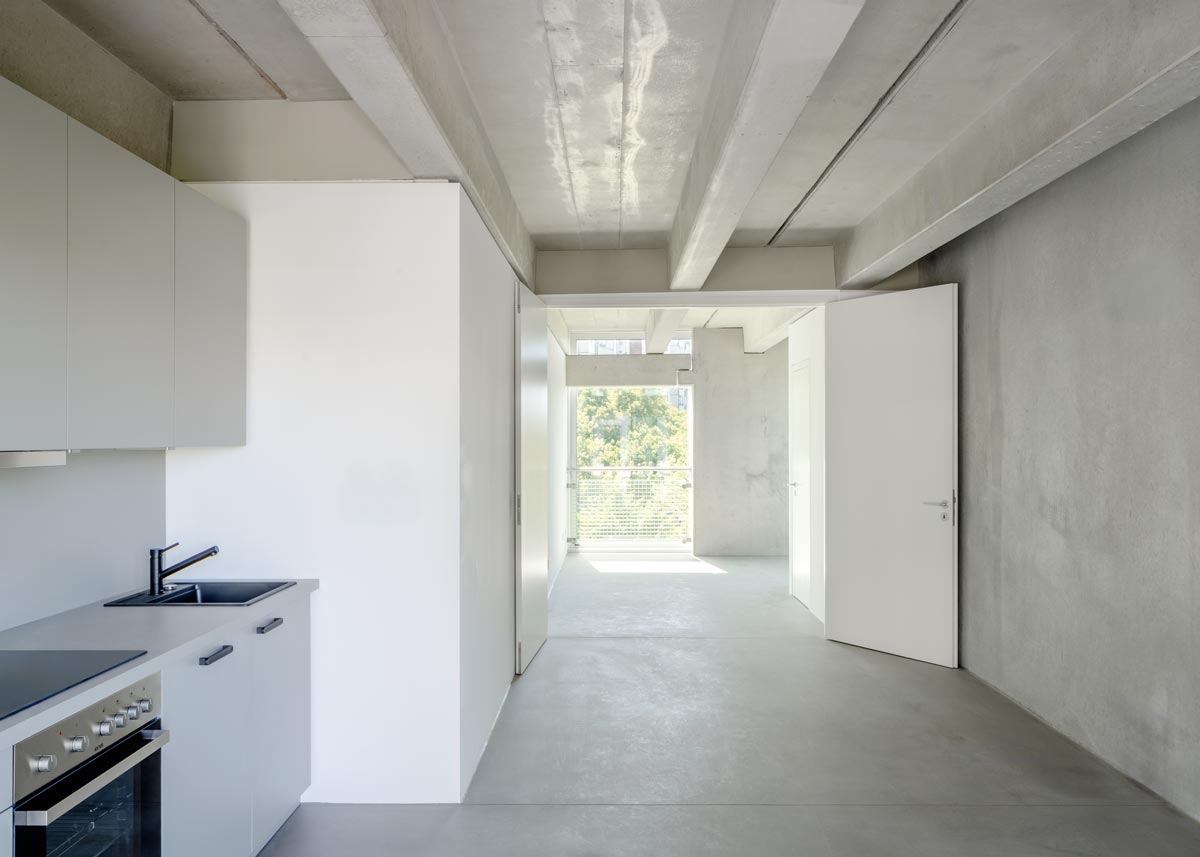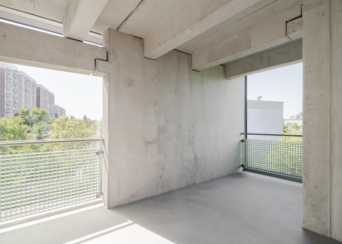 Innerhalb des seriellen Betonrasters entfaltet sich eine überraschend große Diversität an Wohnungstypen. FAR frohn&rojas nutzten die konstruktive Freiheit der stützenfreien Grundrisse für einen Mix, der von kompakten Apartments bis zu zweigeschossigen Townhouses reicht, die unmittelbar am Plateau liegen. Alle Wohnungen sind als Durchwohneinheiten konzipiert, die sich sowohl zum gemeinschaftlichen Gartenplateau als auch zur umgebenden Nachbarschaft öffnen. Dadurch werden flexible räumliche Konfigurationen möglich, bei denen private und halböffentliche Zonen individuell orientiert werden können. Die serielle Struktur wirkt wie ein Wohnregal, das unterschiedliche Lebensmodelle strukturell gleichwertig aufnehmen kann, ohne seine formale Klarheit zu verlieren.