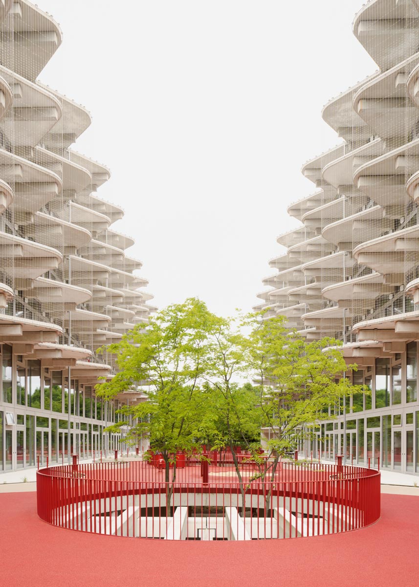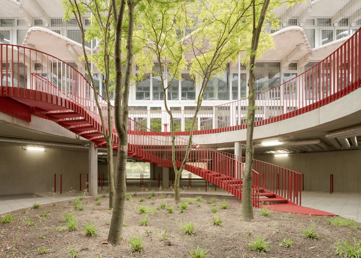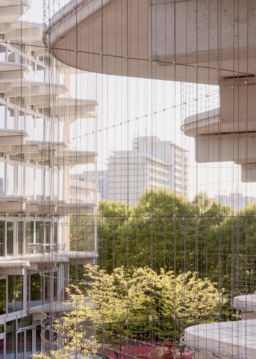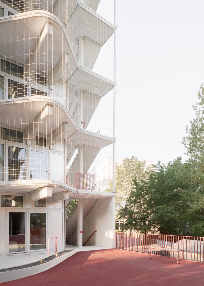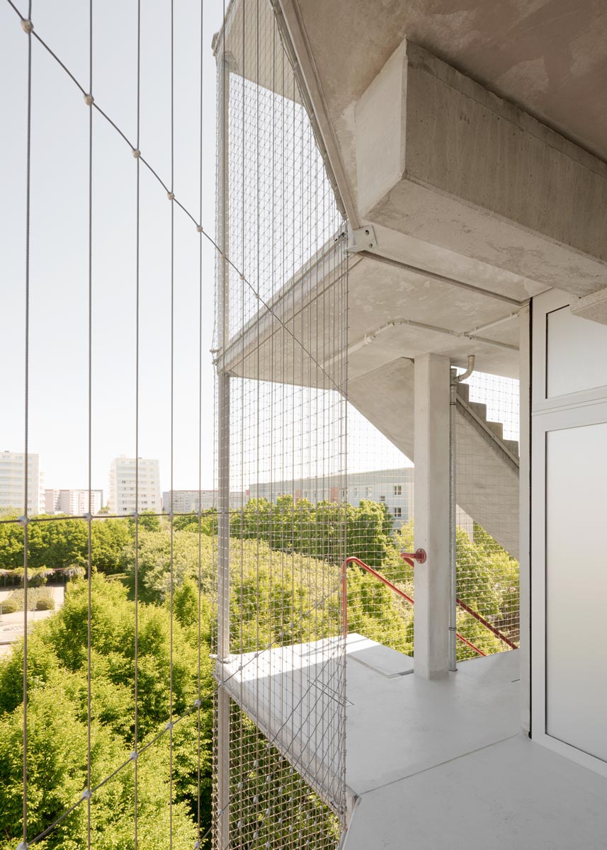 Die Erschließung ist als Teil des sozialen Gefüges gestaltet. Zur Gartenseite öffnen sich Laubengänge, die Zugang und Aufenthaltsqualität miteinander verbinden. Wellenförmig erweiterte Bereiche werden zu kleinen Logen, die den Blick auf das Plateau lenken und gleichzeitig einen privaten Schwellenraum bilden. Ein filigranes Edelstahlgewebe dient als Absturzsicherung und Rankhilfe und macht die Laubengänge perspektivisch zum Teil einer vertikalen Gartenlandschaft. Die vier außenliegenden Treppenhäuser rhythmisieren den Baukörper und unterstützen die Lesbarkeit als poröse, durchlässige Struktur, die Gemeinschaft nicht erzwingt, sondern räumlich ermöglicht.