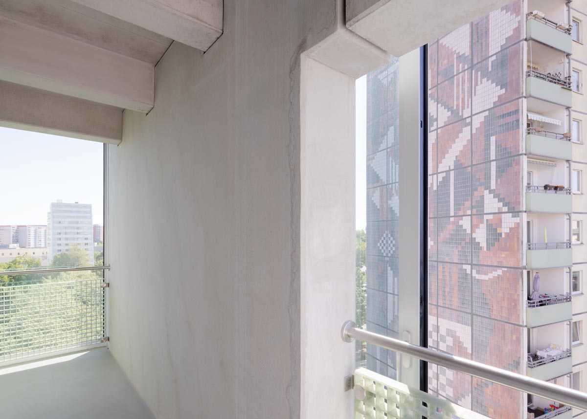 Die Lion-Feuchtwanger-Straße 61 besetzt dabei eine Stelle von außergewöhnlicher räumlicher Spannung: den Kreuzungspunkt zweier Grünachsen, die die Großsiedlung in Nord-Süd- und Ost-West-Richtung durchziehen und deren diffuse Offenheit bislang eher Transit- als Aufenthaltsqualität erzeugte. FAR frohn&rojas reagieren nicht mit einer Wiederholung der Platte, sondern mit einer radikal reduzierten Betonskelettstruktur, die den industriellen Logiken des Hallenbaus entlehnt ist und daraus ein urbanes Wohnregal mit präziser räumlicher Grammatik entwickelt. Das Resultat ist eine urbane Nachverdichtung, die aus der Struktur selbst heraus Stadt generiert und damit eine neue Lesbarkeit der peripheren Siedlung ermöglicht.