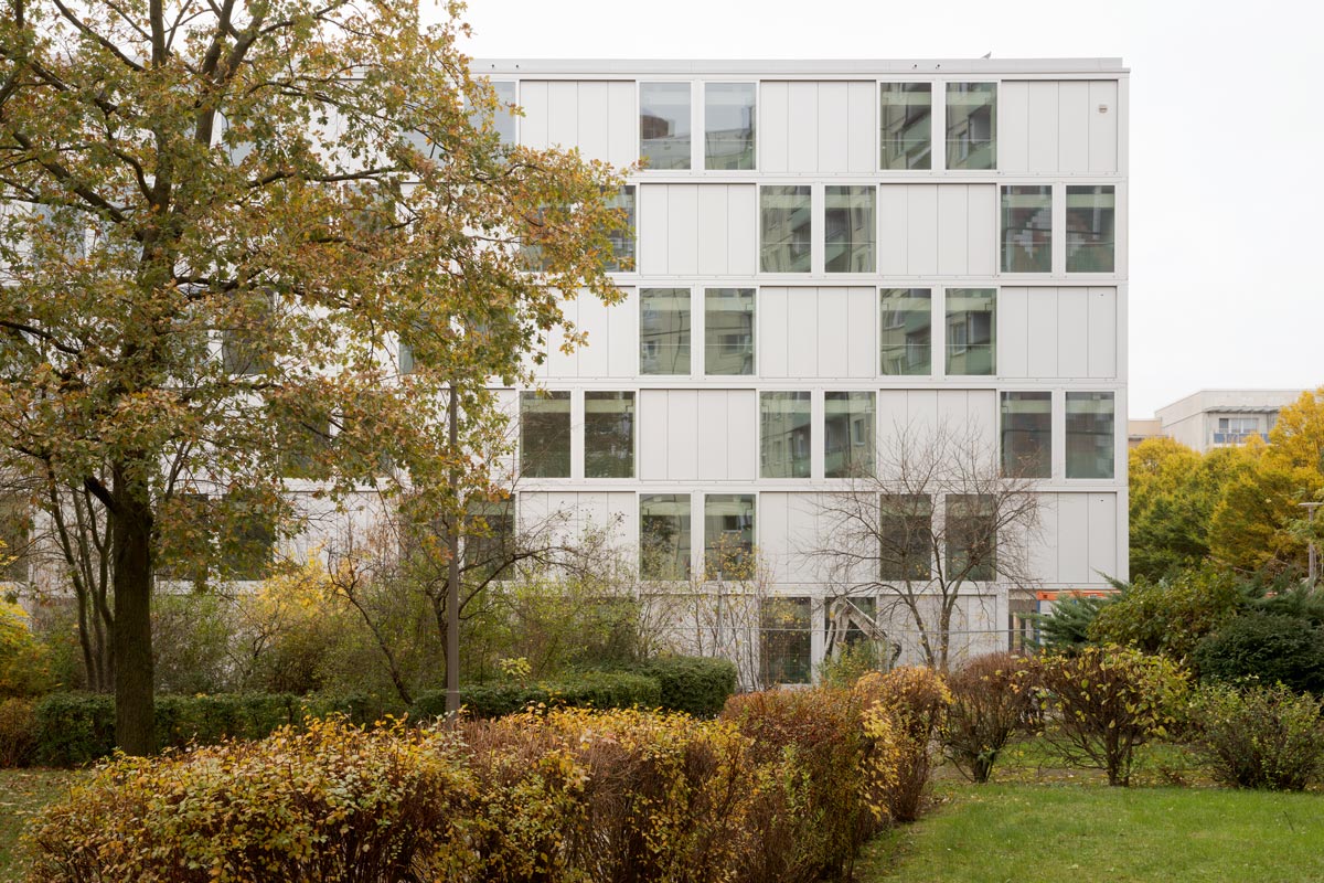 Die Fassaden geben dem Ensemble eine zweistimmige Identität. Zur Nachbarschaft hin zeigen die Riegel eine zurückhaltende Rasterfassade, die aus raumhohen Schiebeelementen und geschlossenen Aluminiumfeldern komponiert ist. Diese abstrahierte Strenge nimmt die Logik der Plattenbauten auf, führt sie jedoch mit feinerem Maßstab und präziser Detaillierung weiter. Zur Gartenseite dagegen lösen sich die Baukörper durch die Laubengänge, Freisitze und die durchlässigen Edelstahlgitter in eine tief gestaffelte räumliche Struktur auf. Sichtbeton, Metall und Glas erzeugen eine industrielle, zugleich sehr kontrollierte Ästhetik, die sich bewusst vom farbigen Putz der Bestandsbauten absetzt und den experimentellen Charakter der Anlage unterstreicht.