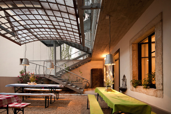 Zuerst sind wir durchgegangen und haben die sogenannten ‚Identitätsstifter‘ festgestellt, was macht das Haus aus? Biedermeierhaus ist ja nicht gleich Biedermeierhaus. Das hat natürlich subjektive Aspekte in sich. Da waren einmal die Steinfaschen bei den Fenstern im Hof, dann die vielen 200 Jahre alten Türen aus Holz, teilweise mit geätzten Gläsern. Im Hof gab es ein Magazingebäude, das fast den ganzen Hof besetzte. Da ein Lokal im EG entstehen sollte, und dieses einen Gastgarten für den Sommerbetrieb benötigte, fiel der Entschluss, das Magazingebäude abzureißen. Dabei entdeckten wir unter dem Pultdach des Objektes eine versteckte, tonnenförmige Stahl-Glaskonstruktion (wie bei der Postsparkasse). Diese haben wir gesäubert und erhalten – sie bildet jetzt eine Laubenkonstruktion, ein Rankgerüst für Weinpflanzen, die den Hof einmal überdecken werden. Außerdem haben wir den Raum für die Erschließung mittels Laubengängen gewonnen – die Fluchtwege und der Lift sind im Hof situiert, die Konstruktion für die Laubengänge ist von oben abgehängt, um den Hof stützenfrei zu erhalten.