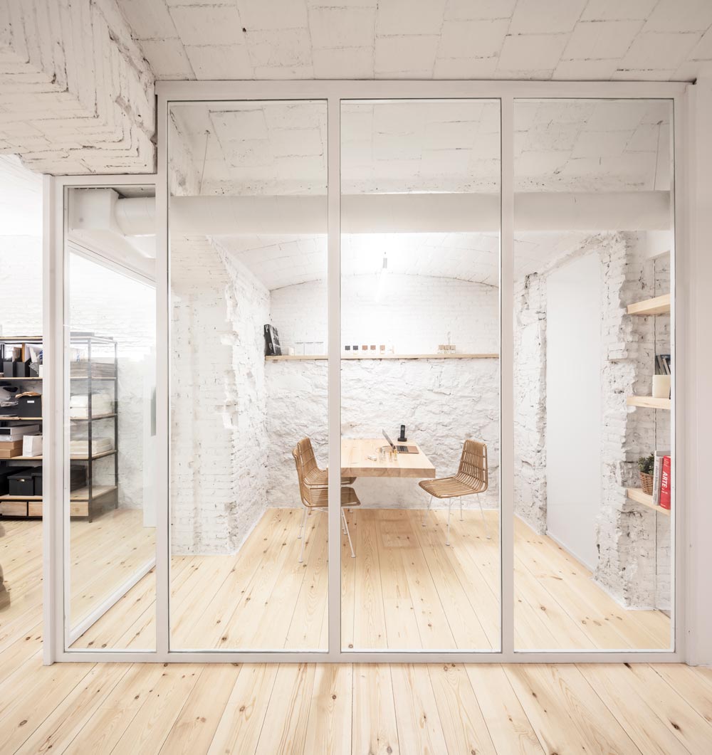 Das Planerteam höhlte den Bestand bis auf seine Grundstruktur komplett aus. Was blieb waren die Stein- und Ziegelmauern sowie die hohen Gewölbedecken mit all ihren Unregelmäßigkeiten. Diese wurden mit Kalk frisch verputzt, neu gestrichen und erstrahlen nun in hellem Weiß. Beim Design ließ man sich in Anlehnung an die Philosophie von Carner von mediterranen Elementen und lokalem Handwerk inspirieren. Sämtliche verwendeten Materialien mussten nicht nur umweltfreundlich und lokal sein, sondern außerdem mit ihrer Haptik und ihrem Zusammenspiel mit Licht überzeugen. Zum Einsatz kamen neben mineralischen Farben, die die Feuchtigkeit regulieren und Böden bzw. Möbeln aus Holz, auch weiße Stahleinbauten und Glas. Das Interieur dient gleichzeitig als Stauraum und Expositionsfläche. Mit seiner schlicht-weißen Farbgebung wird es zum dezenten Hintergrund für die hochwertigen Produkte. Ein Beleuchtungskonzept mit punktuellen und indirekten LEDs rundet den minimalistischen Store harmonisch ab. Sie setzen die Parfümflakons gezielt in Szene und lenken sämtliche Aufmerksamkeit auf die wahren Stars der Parfümerie: die Düfte.